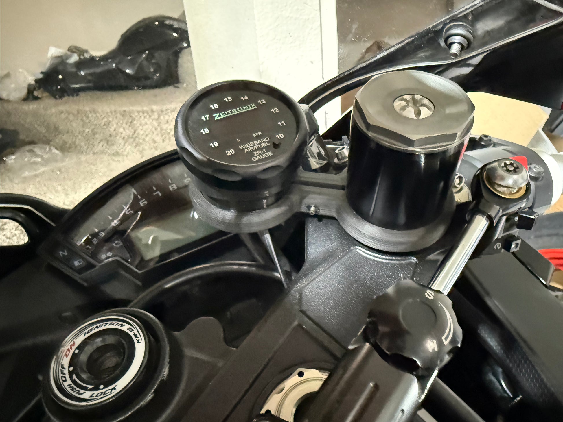 This mount allows you to mount your AFR gauge or other 52MM gauges directly to your motorcycle’s forks. There is a backing plate to support AEM’s mounting bolts, however this gauge can be easily fitted with ZEITRONIX gauges by using a small piece of double sided tape.